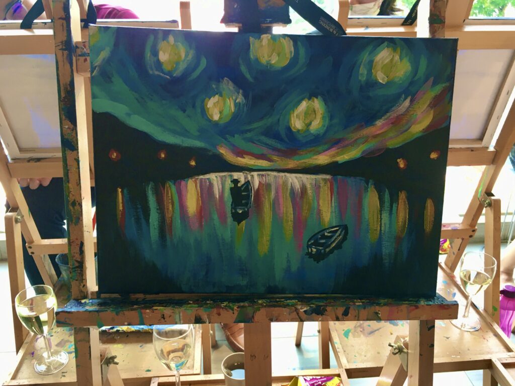 It was an amazing session painting in a cool, air-conditioned room, sipping on some light wine, while being serenaded with a curated playlist that was put together by our instructor.
