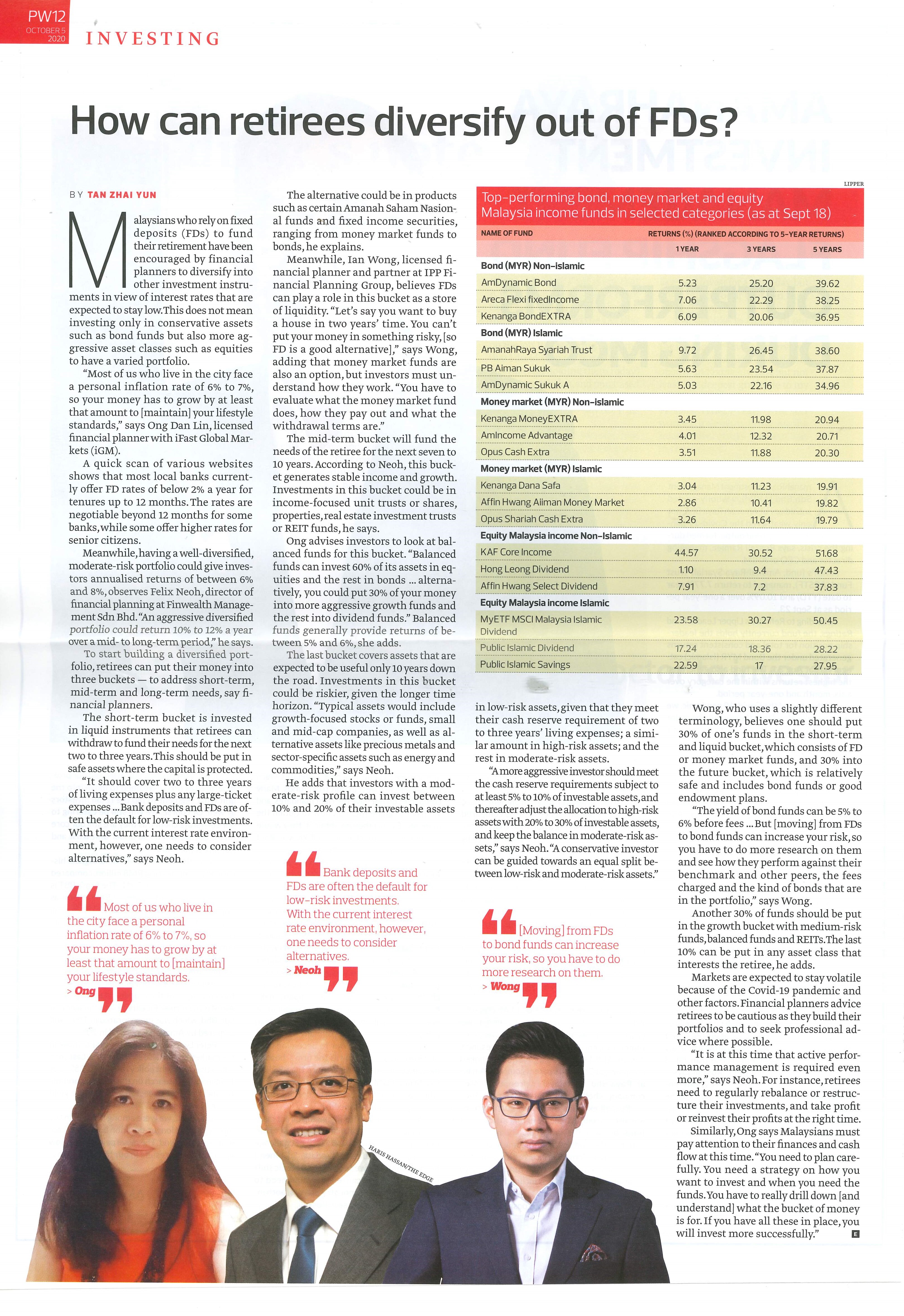 As interest rates are expected to remain low, financial planners have been encouraging Malaysians who rely on fixed deposits (FDs) to fund their retirement to diversify into other investment instruments. Retirees are advised to place their money in three “buckets”, signifying short-term, mid-term and long-term needs.