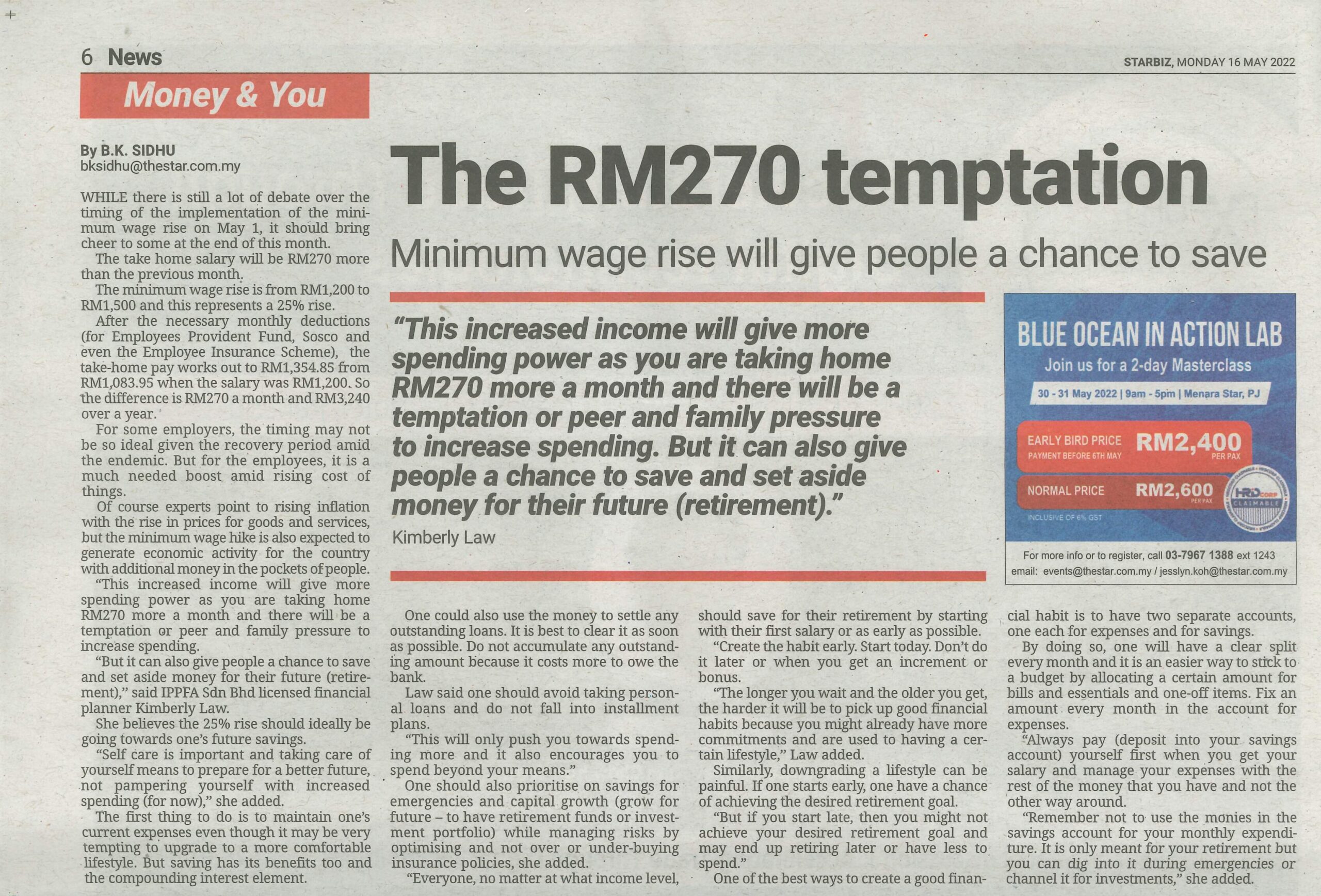 It is imperative to start good financial habits as early as possible before you grow accustomed to a certain lifestyle or take on more commitments. One of the tips Kimberly offered is to have separate bank accounts for savings and expenses. When you receive your salary, always deposit into your savings first and then use the balance to manage your expenses. Your savings account should be reserved for your retirement and any emergencies, although you can also opt to use it for investments.