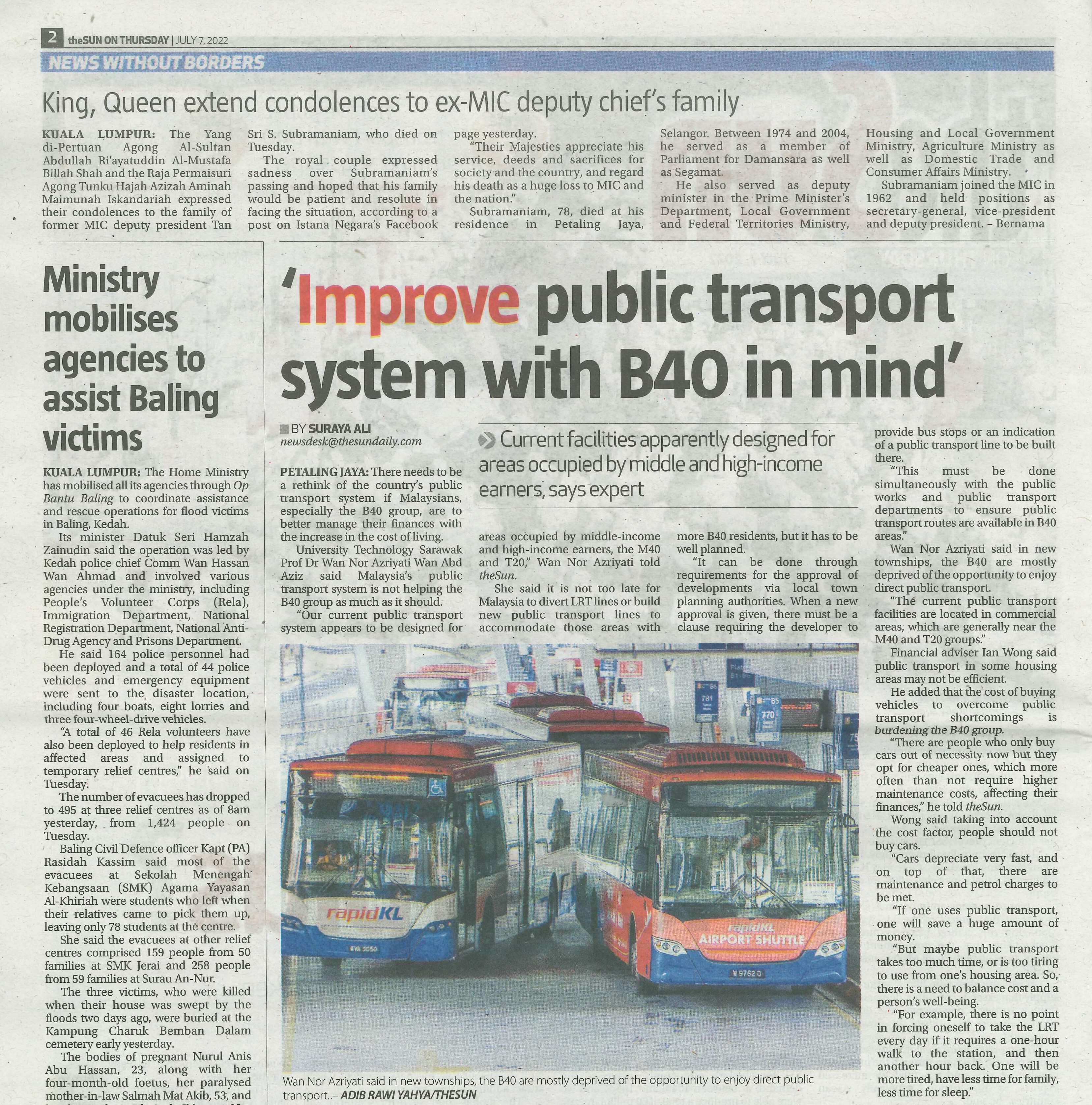 This article seeks to improve our public transport system to become more beneficial for the B40 group. It is noted that currently the system seems to be more accessible for the M40 and T20 groups, with the B40 group being mostly deprived of direct public transport to their residential areas.