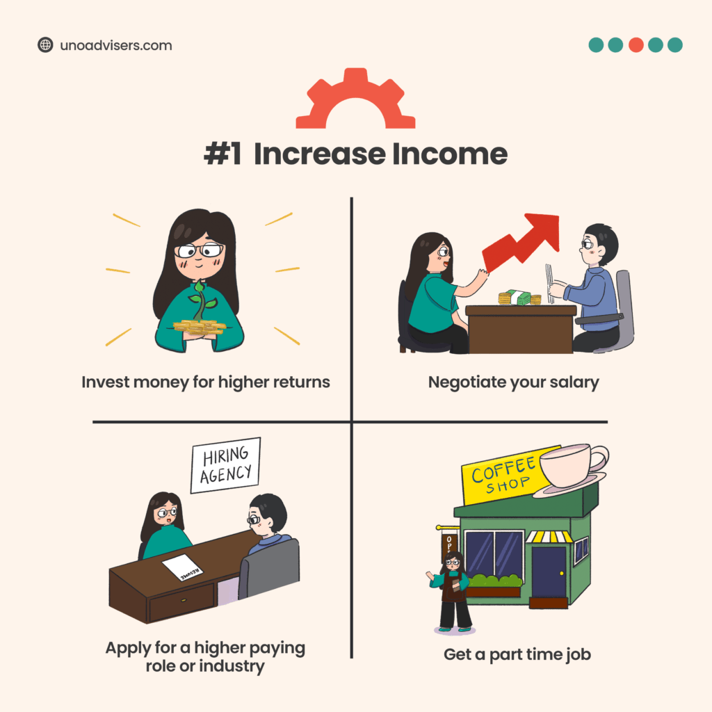 To increase income, there are generally four things. Firstly it would be investing your money for more returns. Secondly it could be renegotiating your current salary. However if that is not possible then you could consider switching jobs to a higher paying role or into a higher paying industry. Finally, if you have the capacity, a side gig or part-time job could supplement your income greatly depending on what role you manage to obtain.