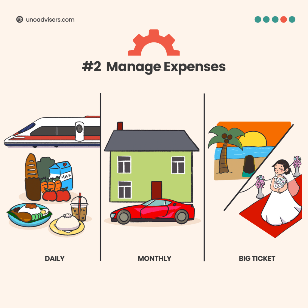 On the other side of the coin, there’s reducing expenses. I like to divide them into three categories for easier management. The categories are big-ticket expenses such as your annual holiday, monthly commitments such as instalments or subscriptions, and daily expenses which is what you spend on a more frequent basis.